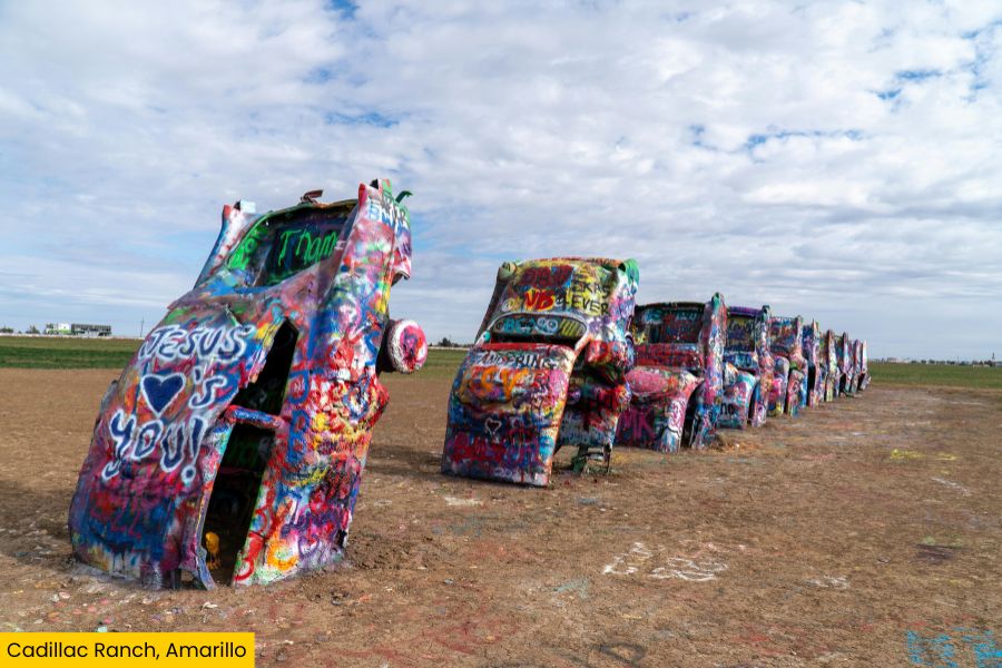 Cadillac Ranch is about 10 minutes away and features ten vintage Cadillacs buried nose-first in the ground, all covered in layers of colorful spray paint.