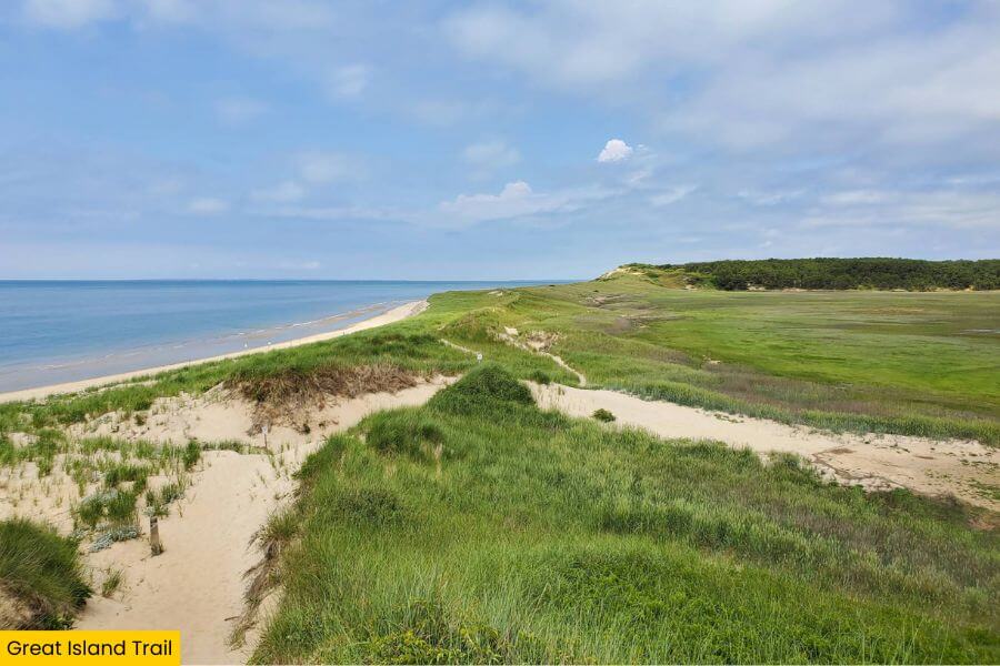 Great Island Trail is an 8.8-mile loop in the Cape Cod National Seashore in Wellfleet, offering nonstop views of the Atlantic Ocean, Cape Cod Bay, and salt marshes.