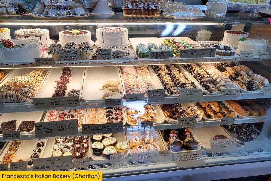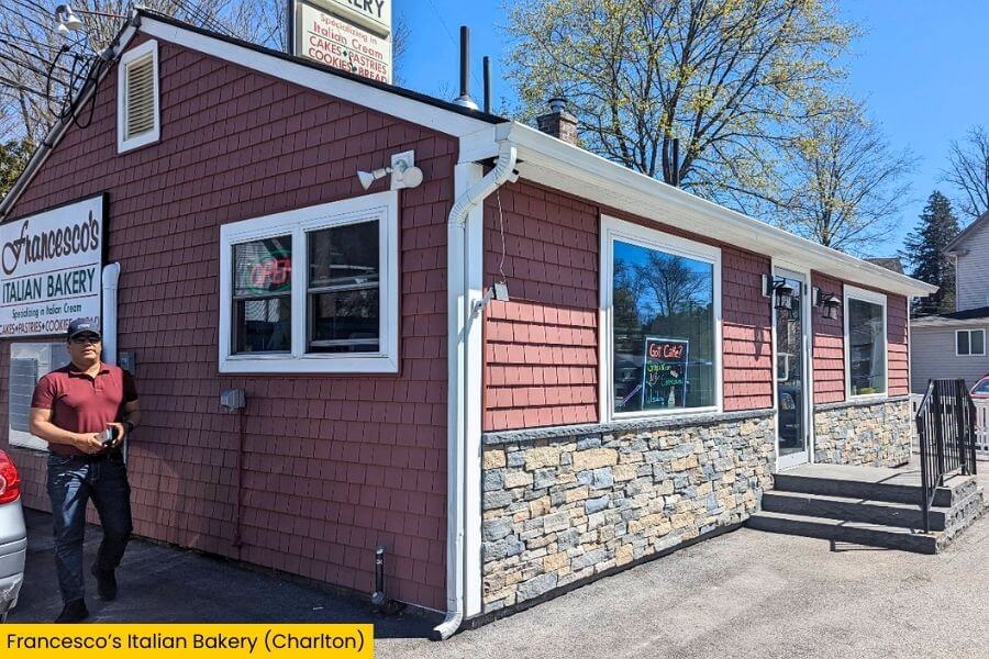 Francesco’s Italian Bakery sits in the town of Charlton near the Route 20 corridor, making it an easy stop if you’re driving between Worcester and Sturbridge.