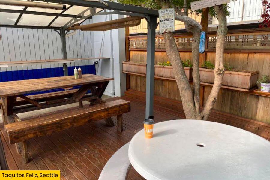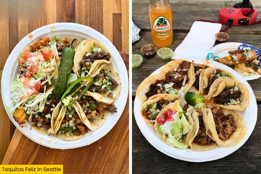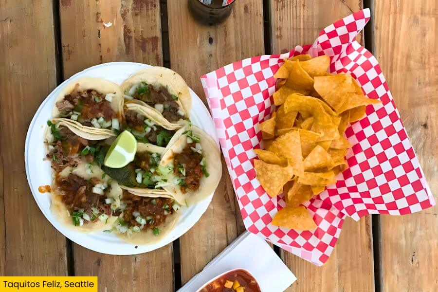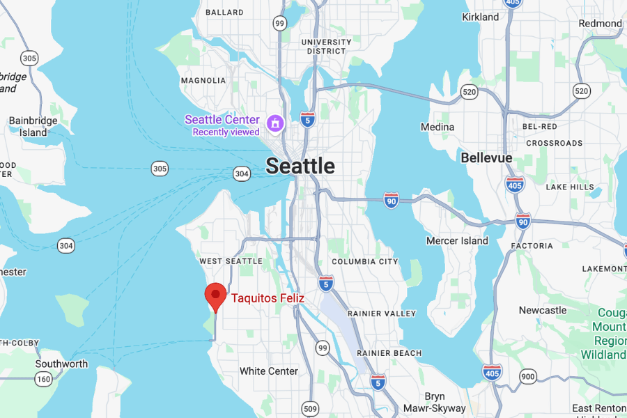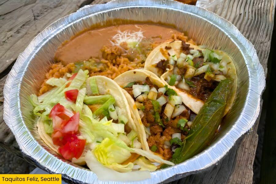 Taquitos Feliz is located at 7413 Fauntleroy Way SW in Seattle, Washington, about a 15-minute drive from the downtown area.