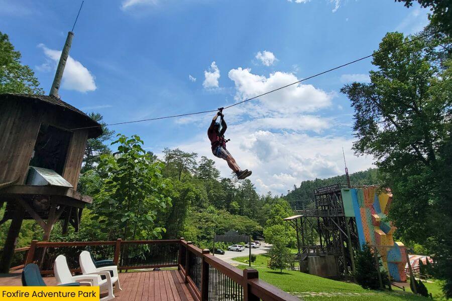 Foxfire Adventure Park is tucked into the Smoky Mountains in Sevierville, Tennessee, and it’s all about zip lines, swinging bridges, and getting way up in the treetops.