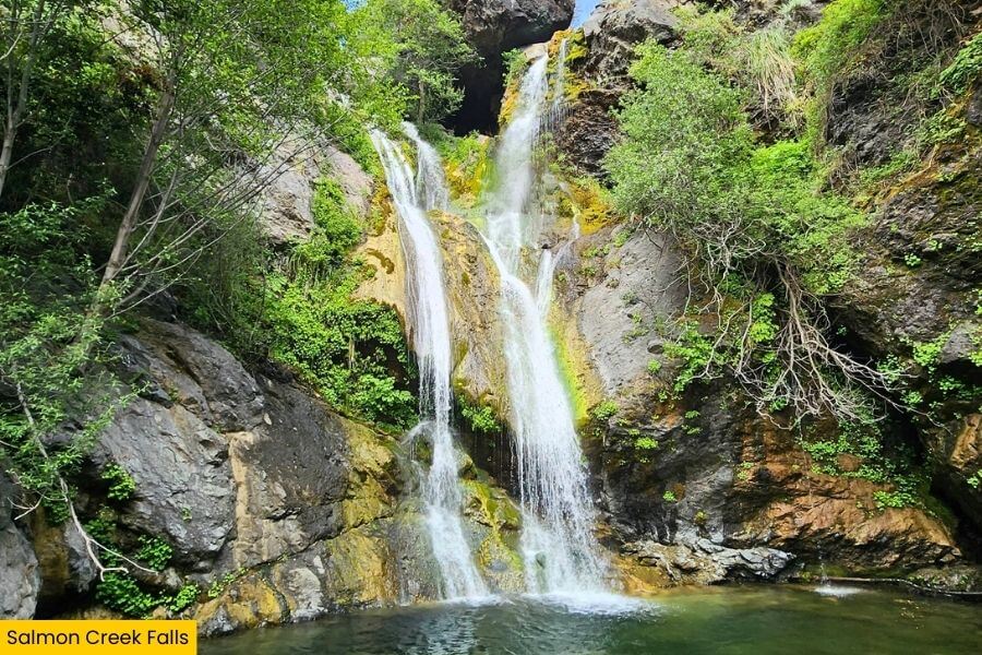 The short 0.3 mile round trip trail starts at a small roadside pullout and follows Salmon Creek along a path before leading you straight to the base of the lower tier.