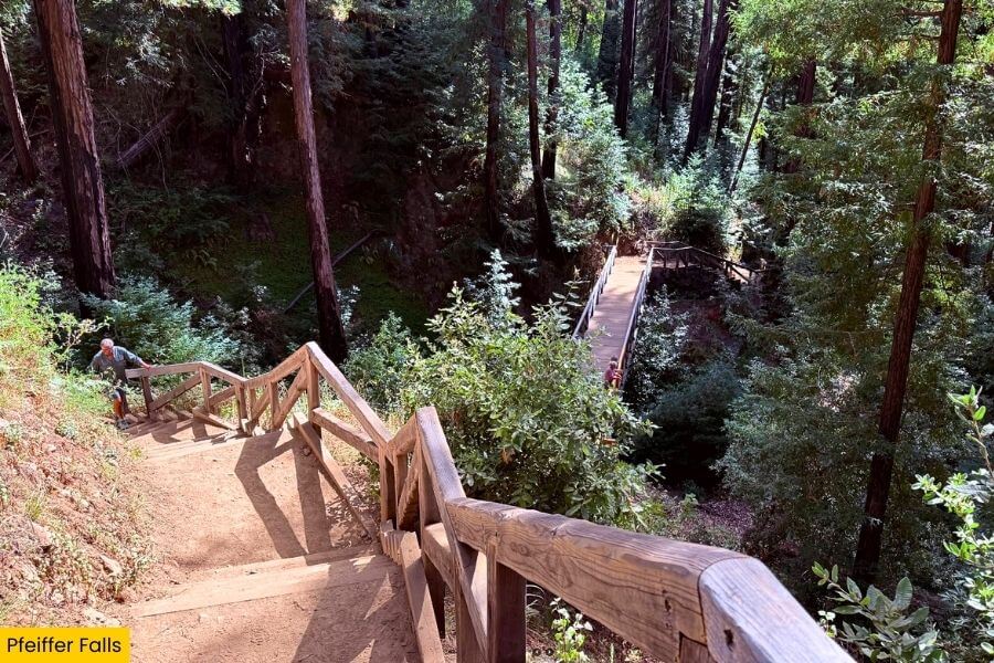 The Pfeiffer Falls Trail is a 2-mile round trip that climbs about 450 feet in elevation, crossing Pfeiffer Redwood Creek on a sturdy footbridge before weaving through redwoods that soar well over 100 feet tall.