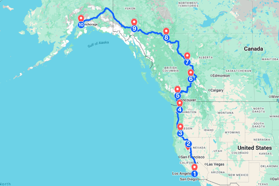 At last, you’ll roll into Anchorage, Alaska, the largest city in the state, set at the end of Cook Inlet with the Chugach Mountains rising just to the east.