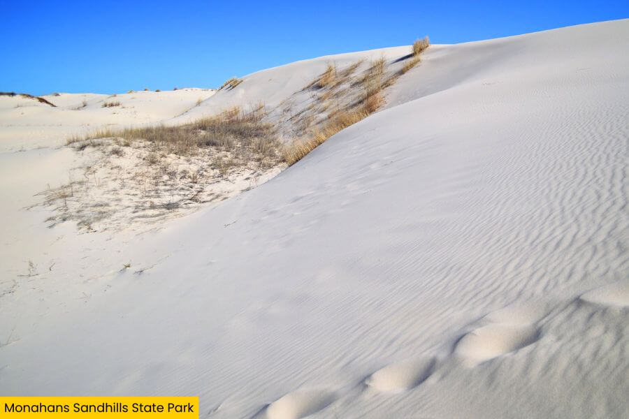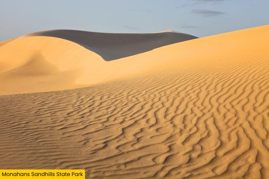 Instead of flat highways or cattle pastures, you’re surrounded by rolling hills of soft sand that shift and shimmer in the wind.