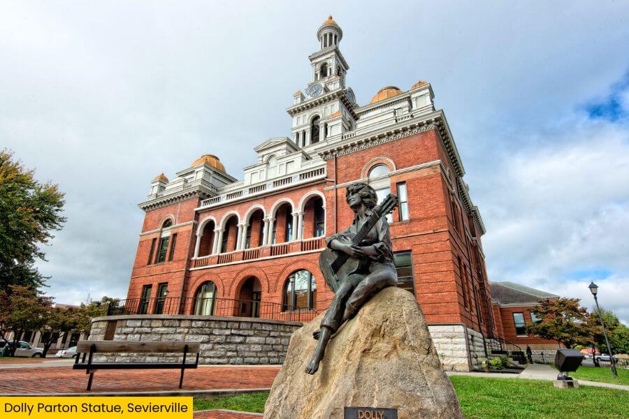 Right in front of the Sevier County Courthouse in downtown Sevierville, you’ll see a life-size bronze statue of Dolly Parton, guitar in hand, smiling as if ready to sing.