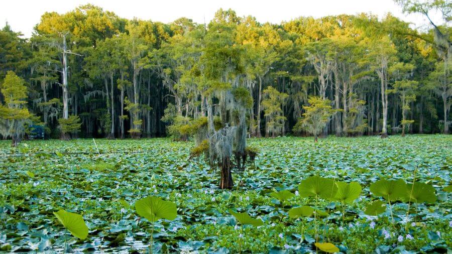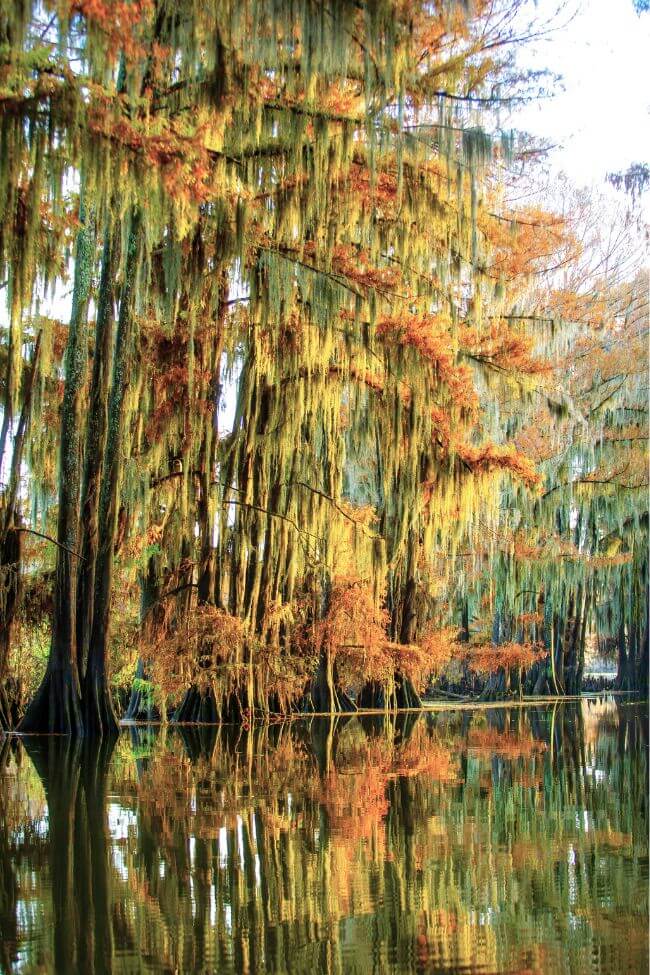 It’s famous for its big cypress trees which are covered in Spanish moss. They grow right out of the water!
