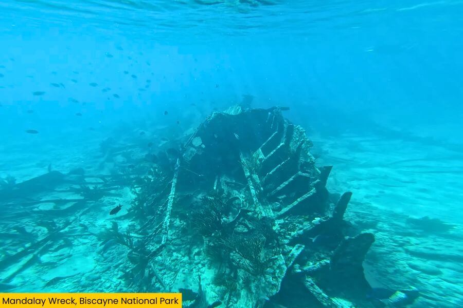 Just a short boat ride away, the Mandalay Wreck sits in the clear blue waters of Biscayne National Park, resting on a coral reef at Long Reef.
