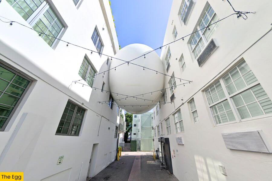 The Egg in Miami Beach is a giant, oval structure that connects two white buildings at 1499 Ocean Court, just a block from the beach.