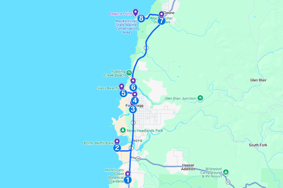 Just a five-minute drive from the gardens, Pomo Bluffs Park gives you sweeping views of the Pacific Ocean, the mouth of the Noyo River, and the harbor entrance.
