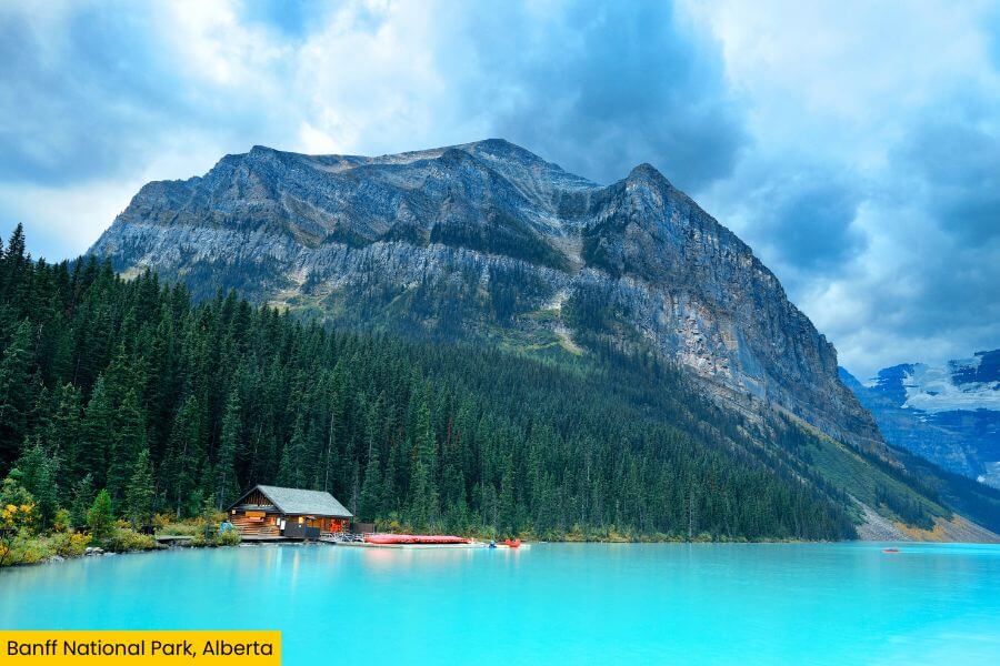 This spot is known for its striking blue lakes like Lake Louise and Moraine Lake, where glacially fed water gives them their bright turquoise color.