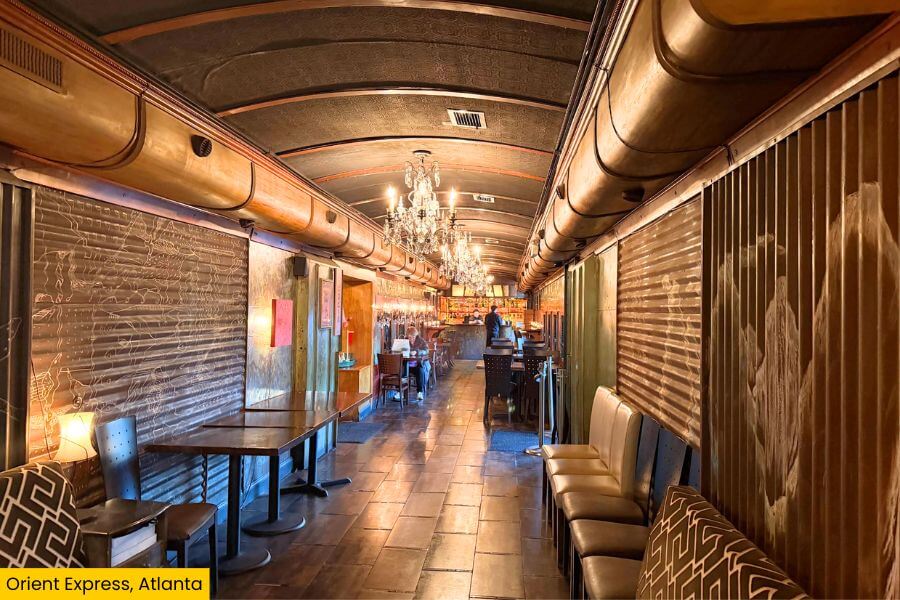 Step inside and you’re greeted with chandeliers, narrow walkways, intimate tables, and that classic train car layout that makes everything feel snug.