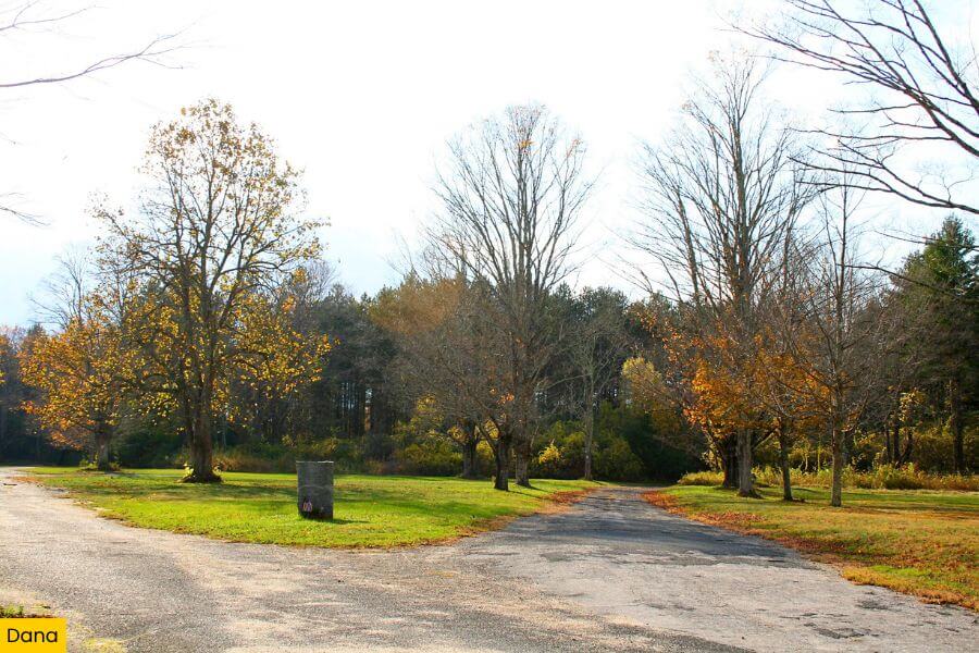 You won’t see the buildings anymore, but the trail to Dana Common winds past old foundations, interpretive markers, and a stone monument at the original town center.