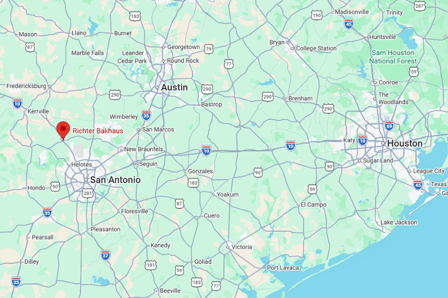 Richter Bakhaus is located in Boerne, Texas, a Hill Country town about 30 miles northwest of downtown San Antonio.