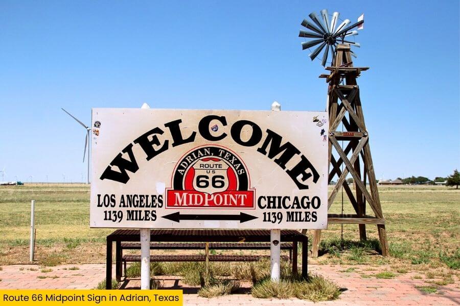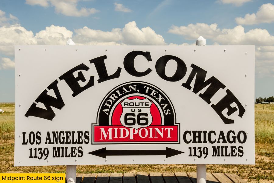 Right across the road from the café, you’ll see the large Midpoint Route 66 sign, which has become one of the most photographed markers on the entire route.