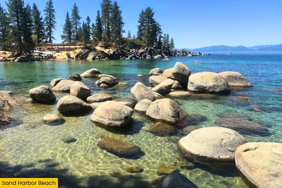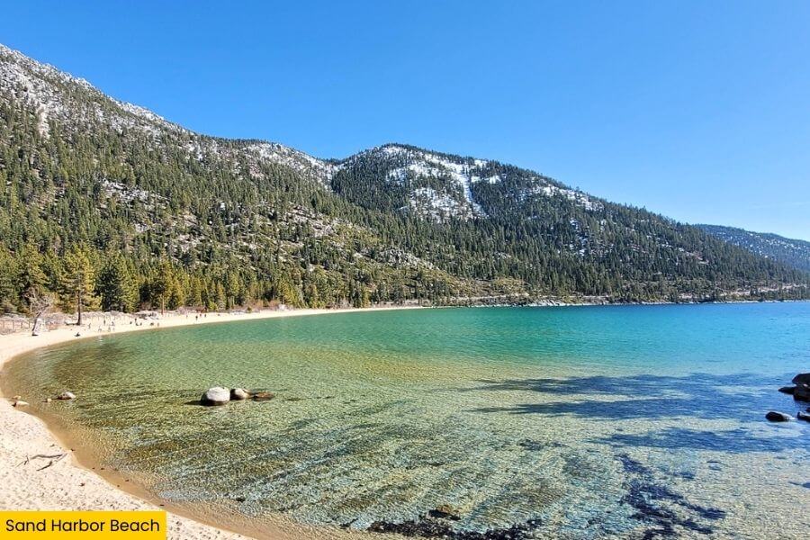The main beach stretches 2,500 feet and has fine, light colored sand, crystal-clear water and the 0.5-mile Sand Harbor to Memorial Point Trail hugging the shoreline.