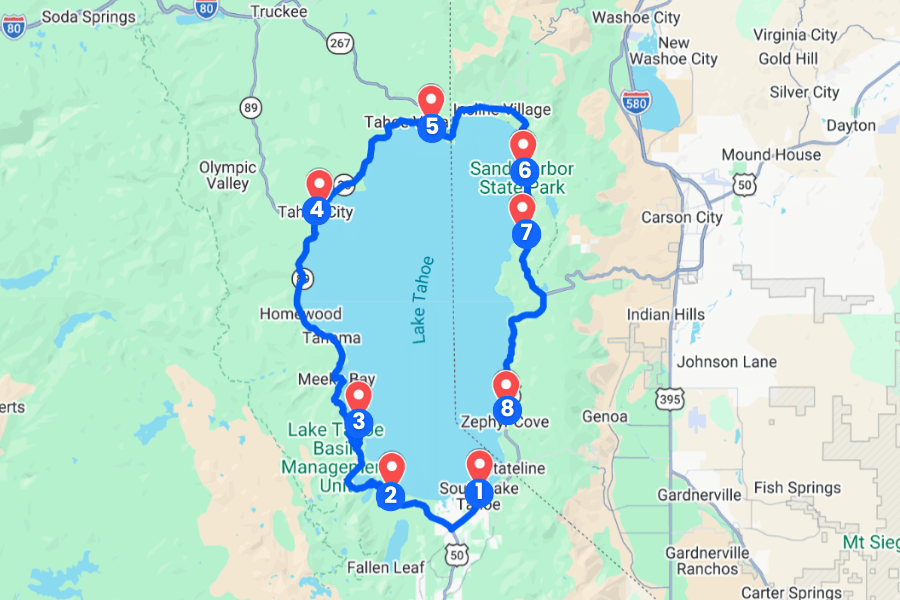 Lake Tahoe is home to 72 miles of shoreline, and this road trip take you to the prettiest stretches of sand all the way around its wide, crystal clear water.