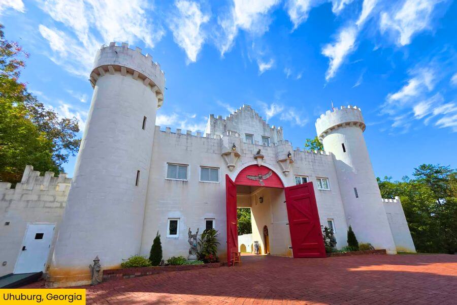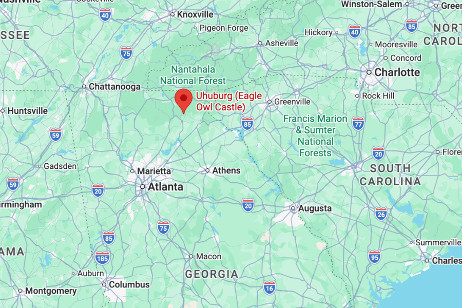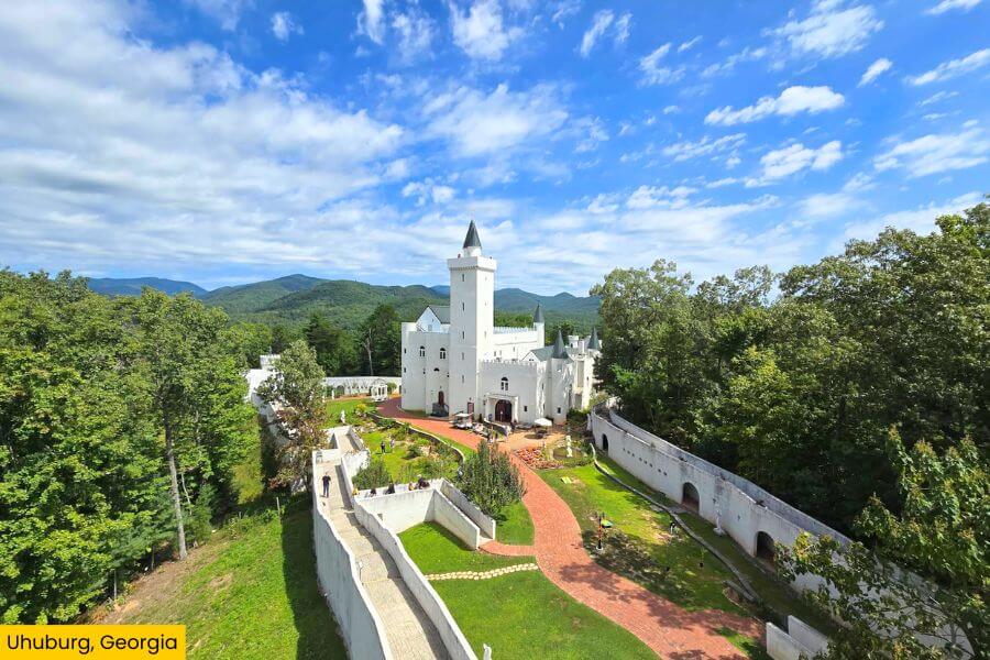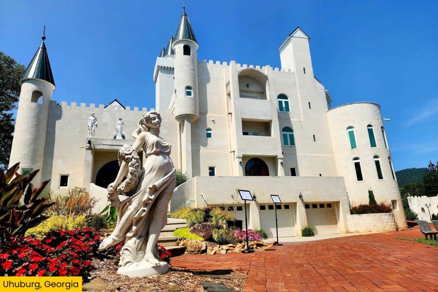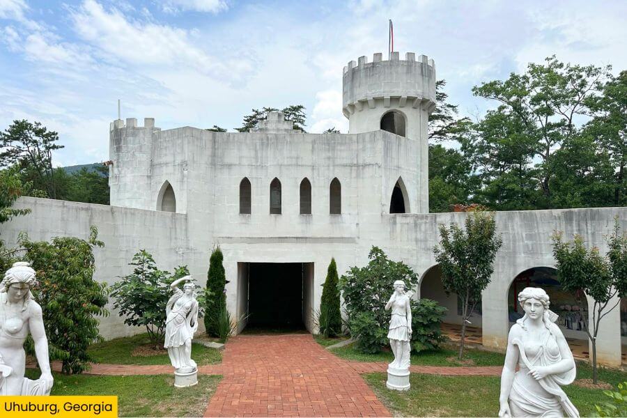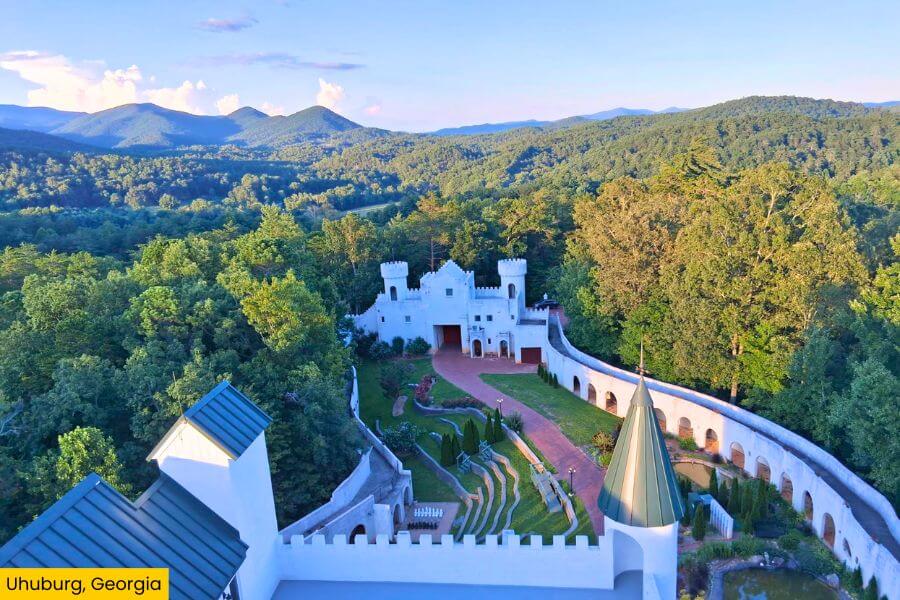 Uhuburg, also known as Eagle Owl Castle, is located at 571 Ridge Road in Helen, Georgia.