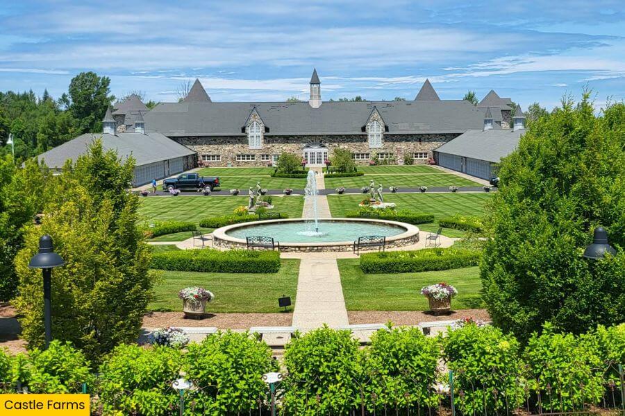 Now make your way to Charlevoix, where Castle Farms stands with a long stone facade, peaked roofs, and manicured gardens centered around a fountain.