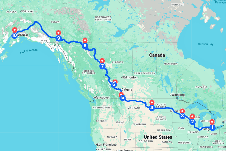 This road trip takes you from the Midwest all the way to Alaska, covering thousands of miles, multiple borders, and landscapes that change fast with every stretch of road.