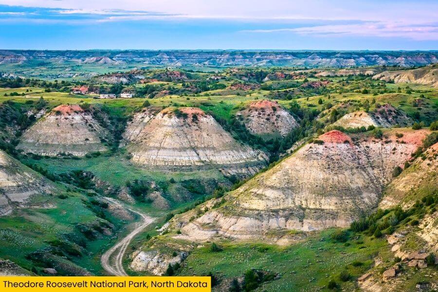 Keep heading west and you’ll hit Theodore Roosevelt National Park in North Dakota, where over 70,000 acres of colorful badlands stretch along the Little Missouri River.