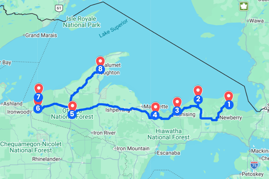 The falls sit in an area shaped by the Keweenaw Peninsula’s copper mining era of the late 1800s, and after exploring the cascades, you’re less than a 15-minute drive from the historic streets of Calumet and the Lake Superior shoreline.