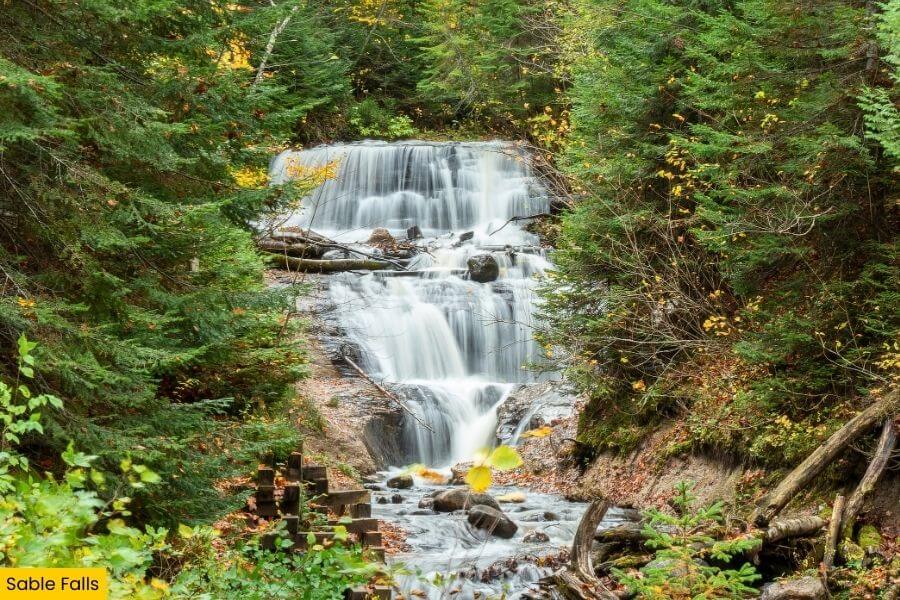 Next up, point your car toward Pictured Rocks National Lakeshore near Grand Marais, where Sable Falls drops through a narrow sandstone gorge just a few minutes from Lake Superior.