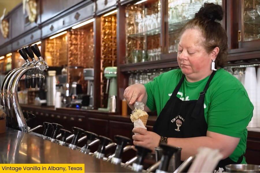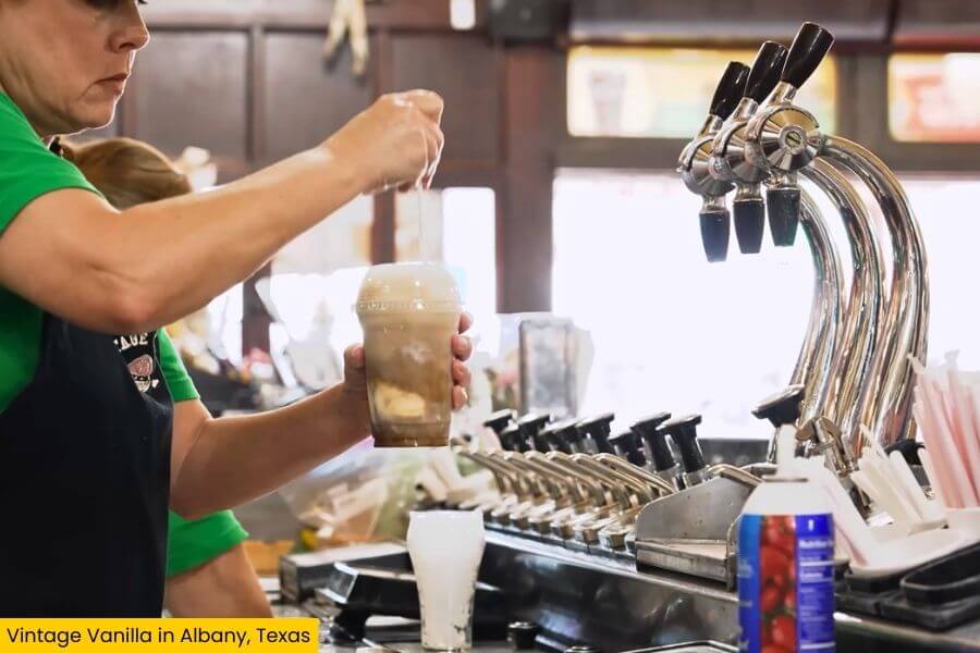 Vintage Vanilla operates in a historic drugstore building dating back to 1929 and was designed to recreate the experience of a traditional small-town drugstore soda fountain that once served as a social hub in communities across Texas.