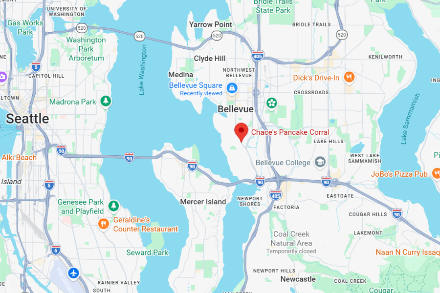 Chace’s Pancake Corral is located at 1606 Bellevue Way SE in Bellevue, Washington, just a few minutes from downtown.