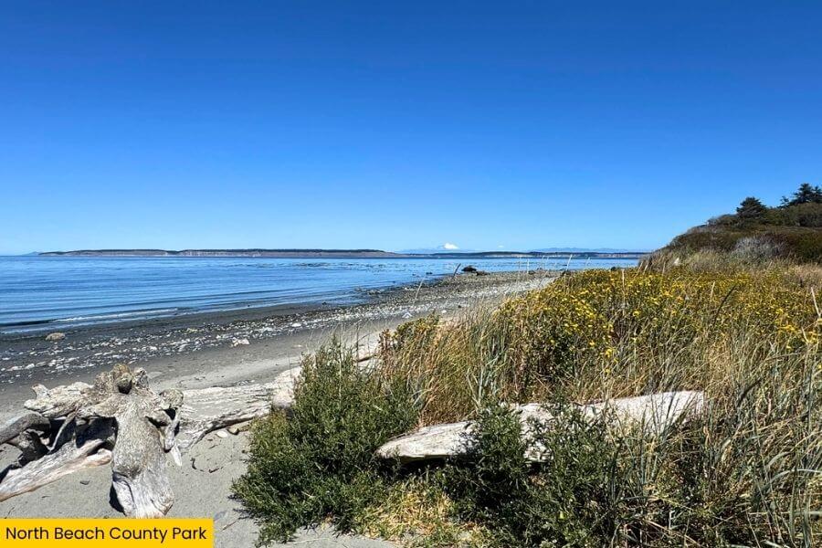 North Beach County Park sits along the Strait of Juan de Fuca, featuring a wide, driftwood-covered shoreline that’s perfect for long beach walks.
