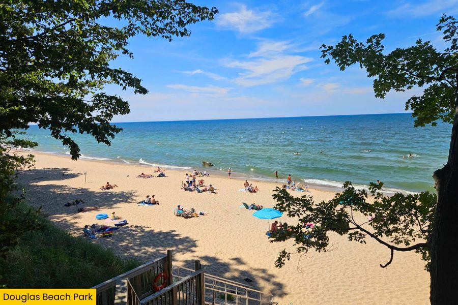 Up next is Douglas Beach Park at 3099 Lakeshore Drive, where a wooden staircase leads down to one of the cleanest stretches of sand in the area.
