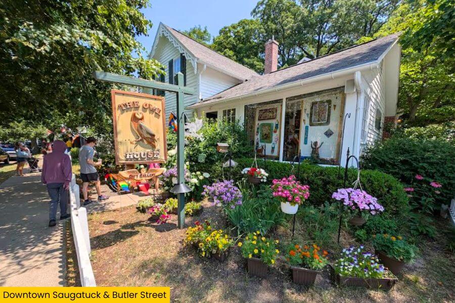 From the ferry landing, stroll five minutes into downtown Saugatuck along Butler Street, the main strip packed with local shops, galleries, and restaurants.