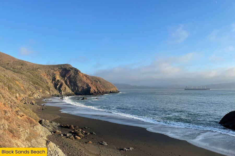 It sits below the Marin Headlands and is reached by a steep trail with a series of stairs leading down to a quiet stretch of dark, almost black sand.