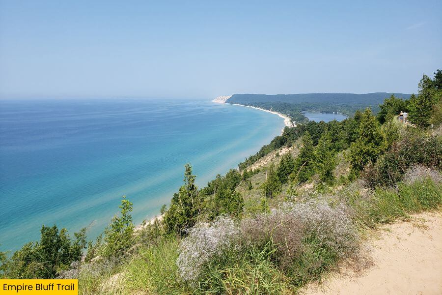 From the bluff, you’re standing about 400 feet above Lake Michigan, looking out at the Manitou Islands and the sweeping shoreline below.