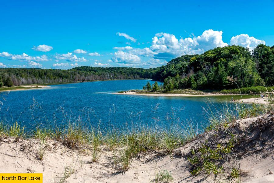 On the North Bar Lake side, the water is shallow, calm, and much warmer, making it perfect for wading or floating without the waves you get on the big lake.