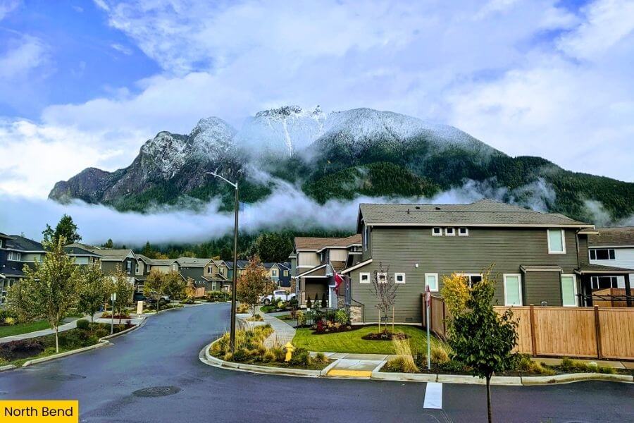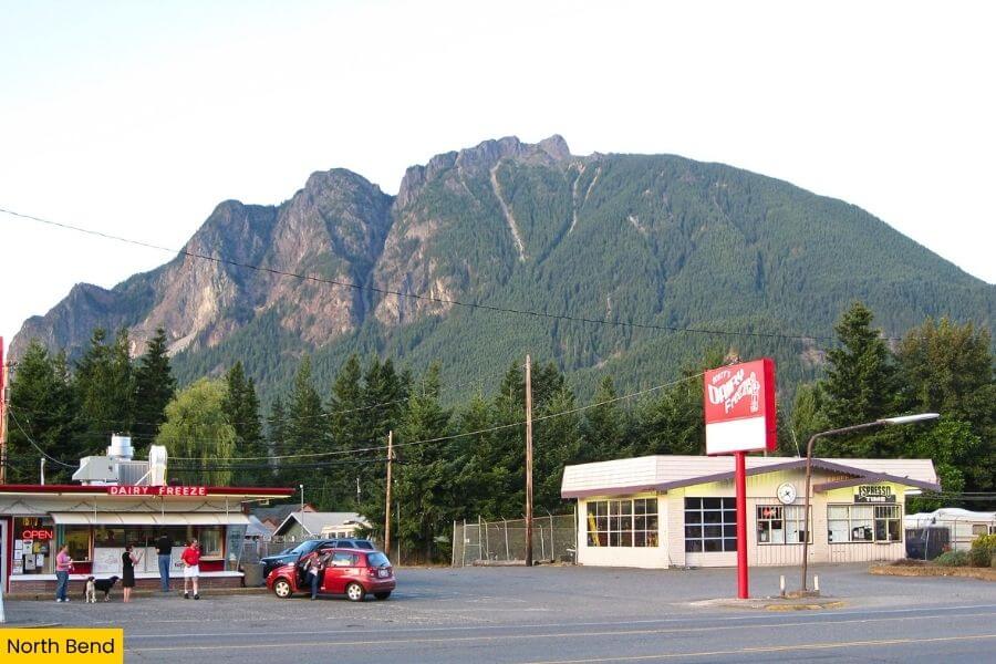 North Bend sits about 30 minutes from Seattle in the Snoqualmie Valley, right at the base of the 4,167-foot Mount Si that towers over town like a movie backdrop.