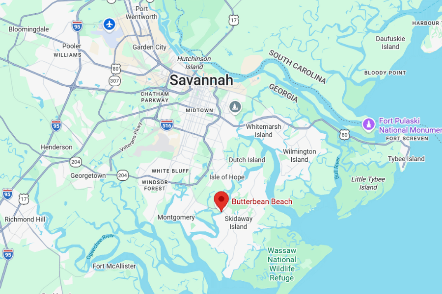 Butterbean Beach is located just 20 minutes from downtown Savannah along the Skidaway Narrows.