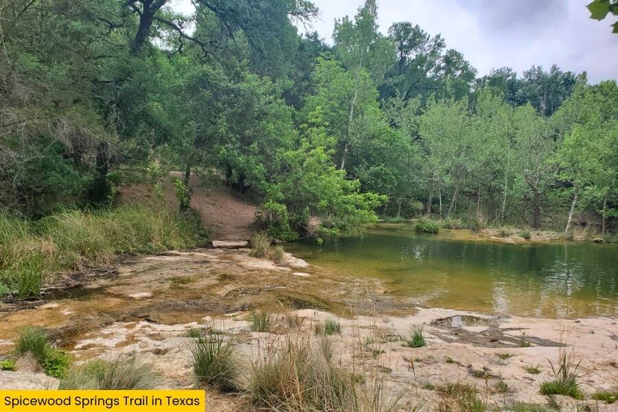 The hike starts at the Spicewood Springs Trailhead inside the park, with parking along the main park road.